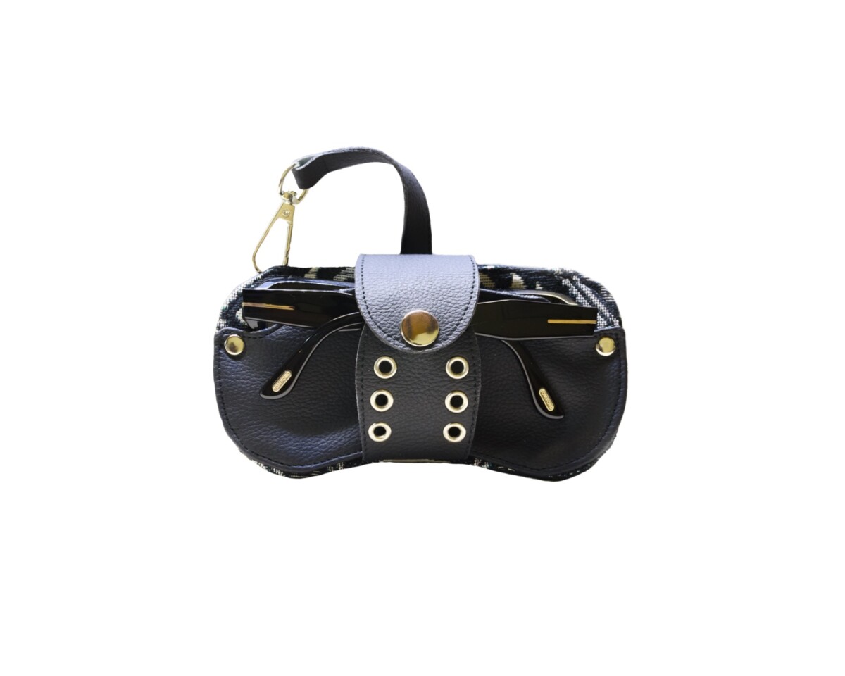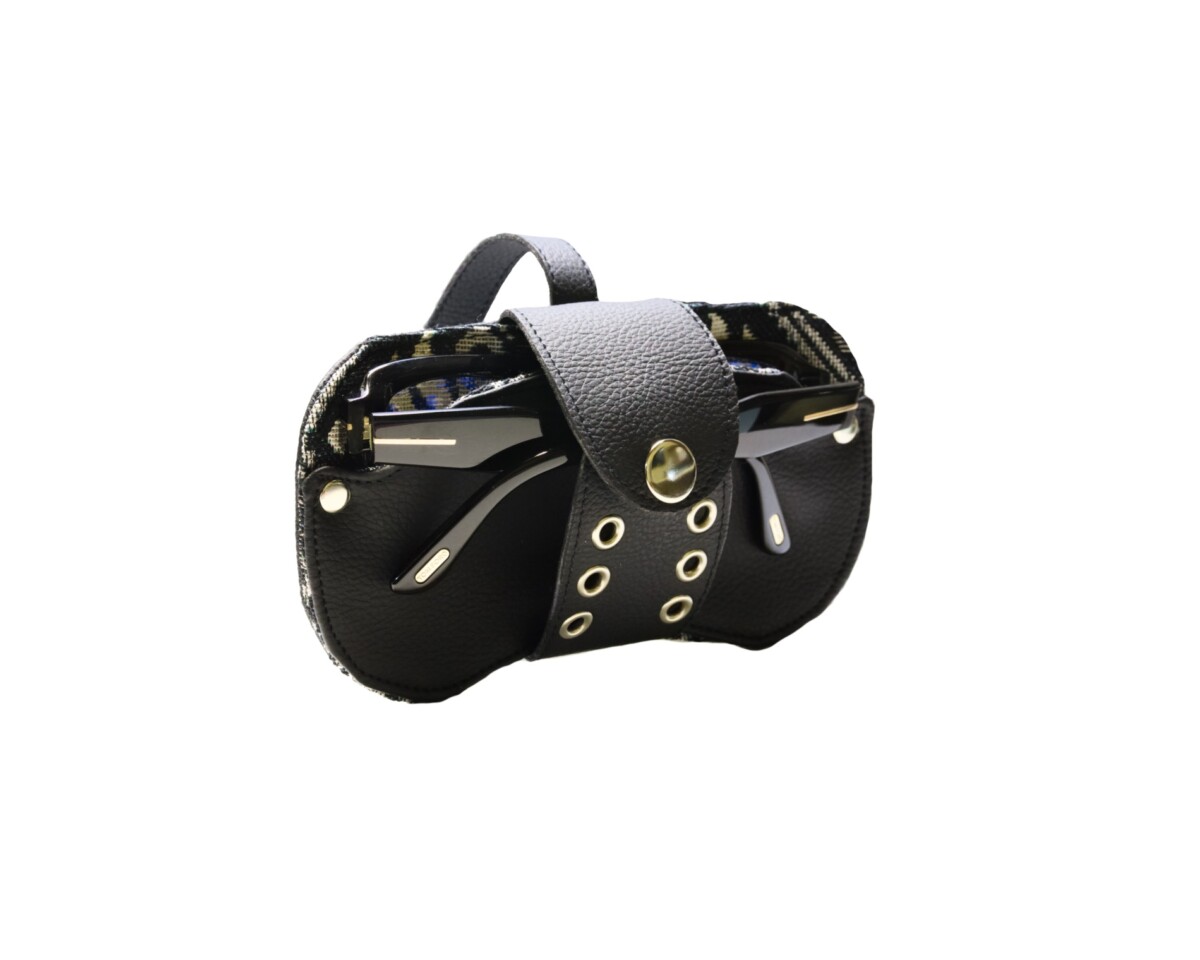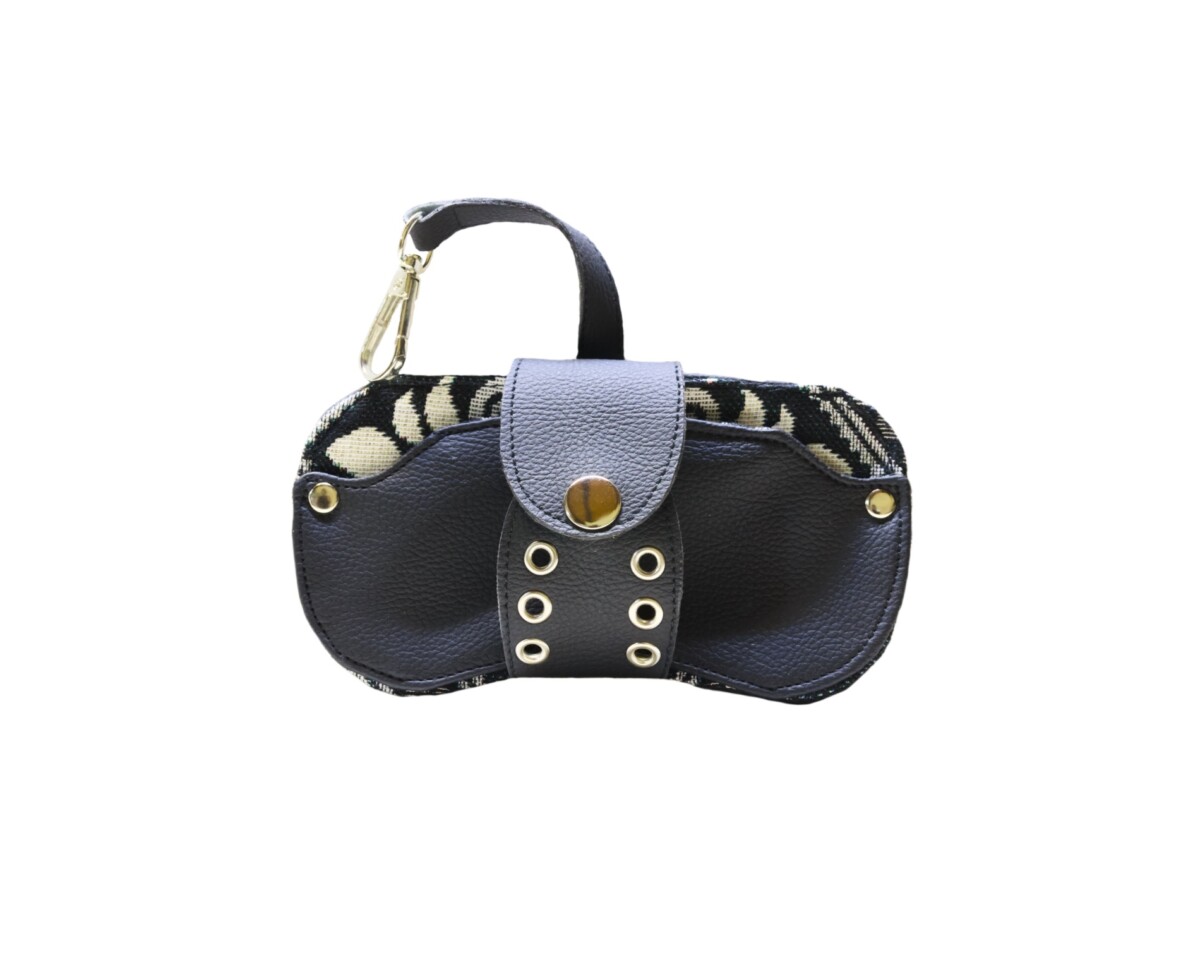 Portaocchiali in ecopelle con borchie e con chiusura a bottone Interno in tessuto broccato sardo Gancio portachiavi Prodotto artigianale Fatto in Italia