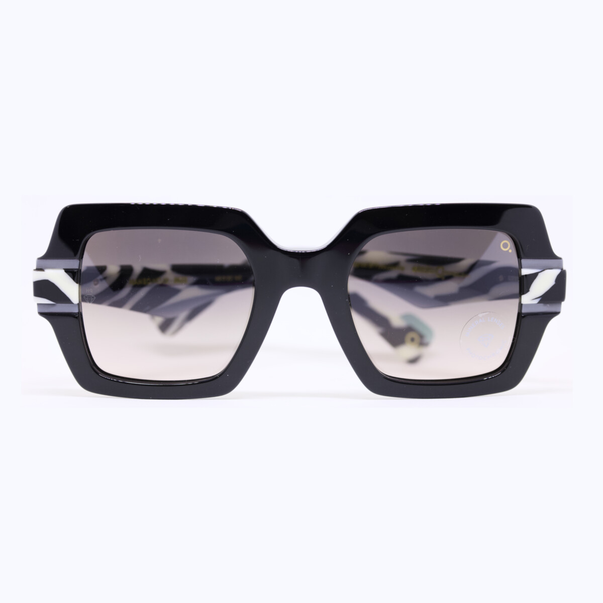 Occhiale da sole squadrato da donna in acetato Calibro 49, ponte 23, lunghezza aste 140 Colore: BKZE – nero lucido, zebra Lenti: fotocromatiche grigio sfumato in cristallo temperato. Categoria 2 Estremamente resistenti e 100% riciclabile Asta flessibile